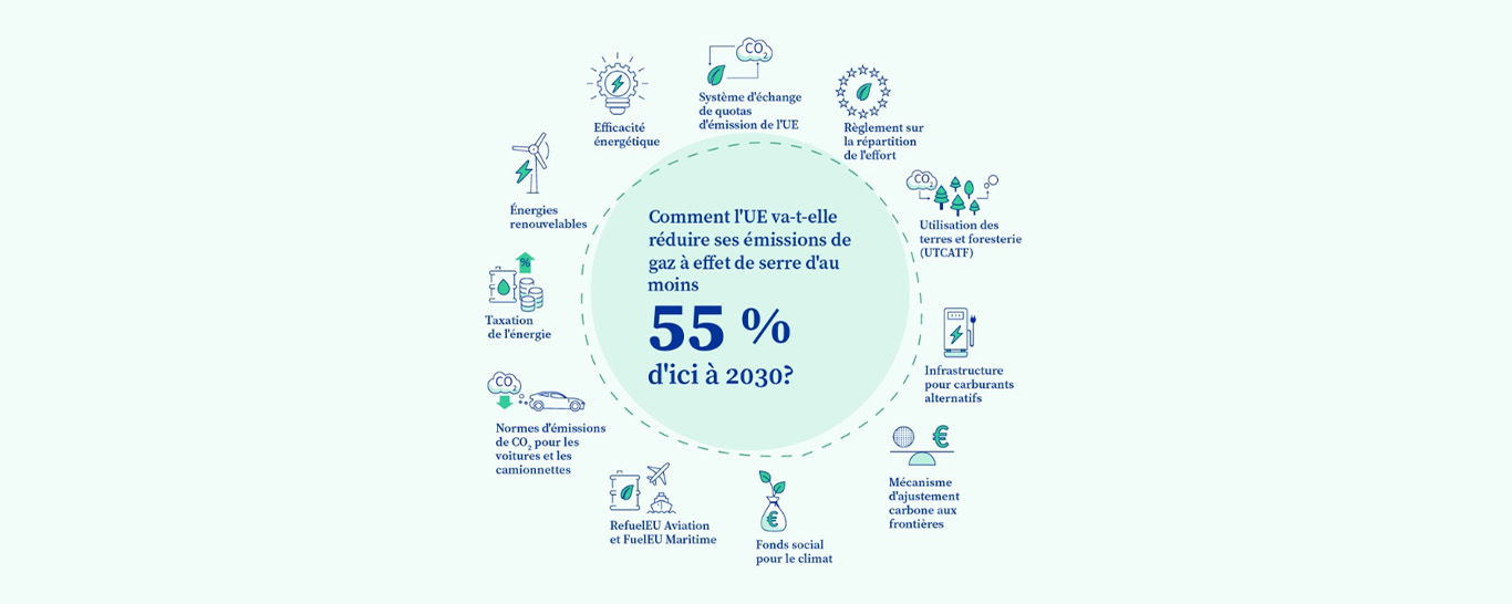 Le 14 juillet 2021, la Commission européenne a publié, dans le cadre du Pacte vert européen, de nouvelles mesures législatives intitulées « Ajustement à l’objectif 55 » (« Fit for 55 »). Ce paquet regroupe un ensemble de 13 propositions législatives, comprenant des directives et des règlements, ayant vocation à atteindre les objectifs de l’Union européenne en matière climatique.